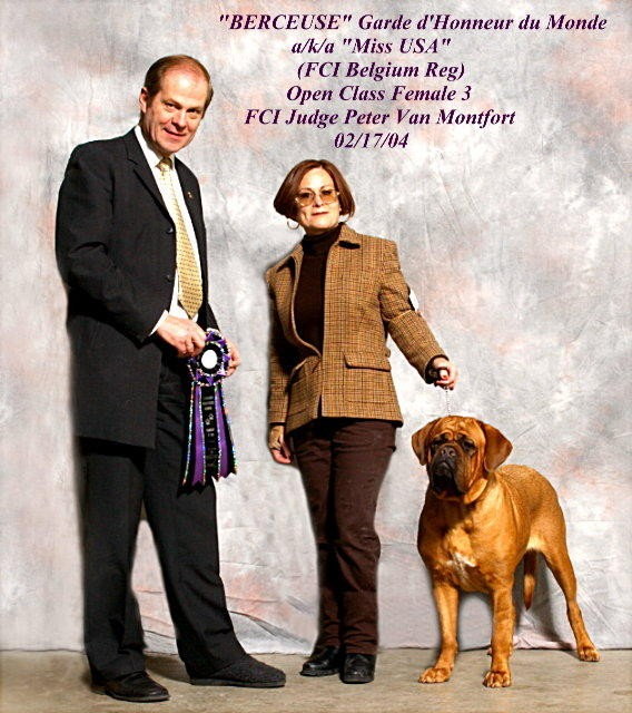 | FCI JUDGE PETER VON MONTFORT ~ NETHERLANDS CANADIAN MOLOSSER ASSOC. BENEFIT SHOW TORONTO, CANADA Jan. 17, 2004 Open Female Class Critique: "EXCELLENT" Excellent Head. Very good size, type and substance. Black Mask needs black nose. Well-shaped skull, good stop, excellent eyebrows. Would like to see more cheekbones. Excellent body, neck and bone. Rectangle body. Very good movement. Well angulated rear. *Owner's note: Nose leather on Black Masks can be temporarily affected by seasonal changes in the amount of sunshine they are exposed to, similar to a fading/increasing tan. This is not considered a disqualifying fault, but can detract from overall points in the ring. Click this link for more on the subject from Triquet's "Saga" of the Bordeaux. |