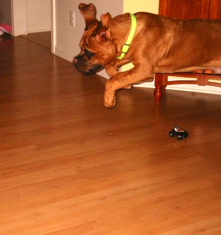 | Boris, the AGILITY DOGUE leaps tall buildings (& monster cars) in a single bound! |