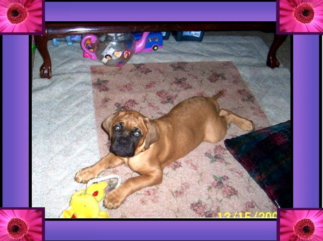 | "No you don't, little Miss! Playtime is OVER! Momma said lights out. And I'm NOT budging...I'm a French Mastiff!" |