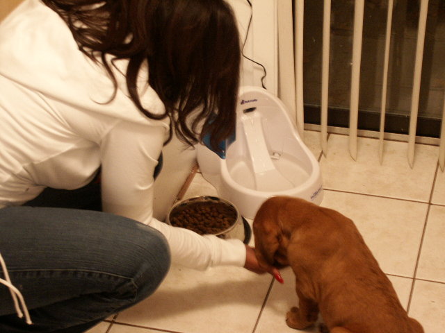 | "Look what Mommy has for me! My very own bowl & water fountain! No more sharing! Yipeeee!" |