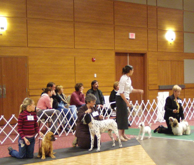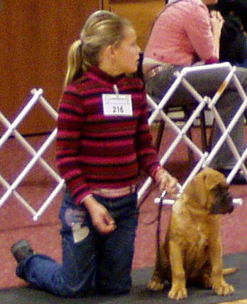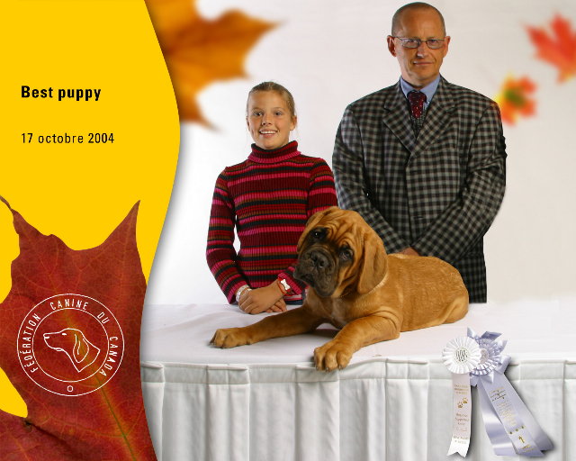 | WAY TO GO SHE DEMON! OUR ADORABLE LITTLE BEV TOOK BEST OF BREED PUPPY OVER THE OTHER BORDEAUXS IN HER CLASS AT THE FALL COLOURS SHOW IN MONTREAL. BEV WENT ON TO COMPETE AGAINST PUPPIES OF OTHER BREEDS IN THE GUARDIAN GROUP, AND TOOK FIRST PLACE OVER ALL OF THE OTHER PUPPY BREEDS IN GUARDIAN GROUP! LOOKS LIKE BEV IS DESTINED TO CARRY ON THE FAMILY TRADITION! OUR SPECIAL THANKS TO SARAH MUTH, JR. HANDLER AND DAUGHTER OF PETER & TRACY MUTH OF CHATEAU ROUGE BORDEAUXS IN CANADA, WHOSE EXPERT HANDLING GUIDED BEVERLY HEELS TO THESE PROUD WINS FOR HER DEBUT SHOW! |