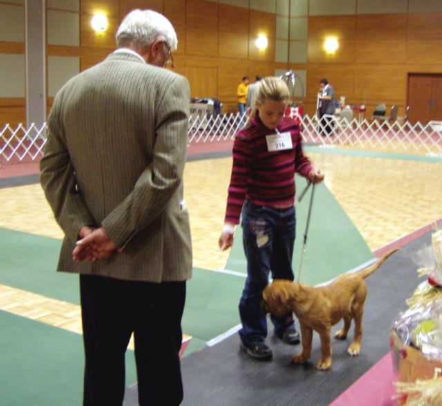 | Buckstrut's Beverly Heels (3 mos.) with expert Jr. Handler, Sarah Muth of Chateau Rouge Bordeauxs, Canada, and FCI Judge, Stefan Sinko (A BIG puppy slurp for Judge Sinko and Sarah!) |