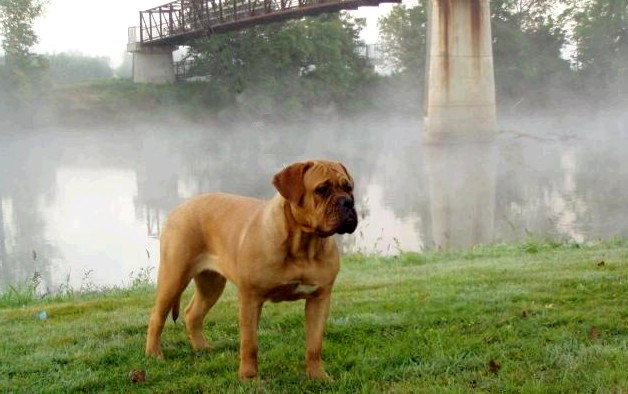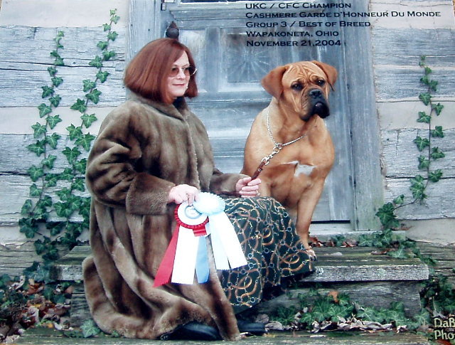 | UKC/CANADIAN CHAMPION " CASHMERE " WAPOKONETA OHIO ~ NOVEMBER 2004 BEST OF BREED & GROUP 3!! Cashmere took Best of Breed DDB, then went on to take 3rd place against stiff competition with other molosser breeds in Guardian Group! (Pictured here with Terri at historic building on Wapakoneta show site grounds.) |