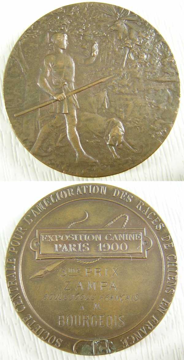 This is a medal from our collection of dog show medals. It dates to 1900;the World Exposition, held in Paris, France. This medal was awarded for 3rd place to a French Bulldog...a much smaller breed than the French Mastiff, or Dogue de Bordeaux. The medal features St. Hubertus with his loyal hounds. Hubertus hails a large stag with a cross and aura on its antlers. Mastiffs were used to hunt a variety of wild beasts including bears, boar and wolves. St. Hubertus' seal can be found on FCI Pedigrees world wide. |